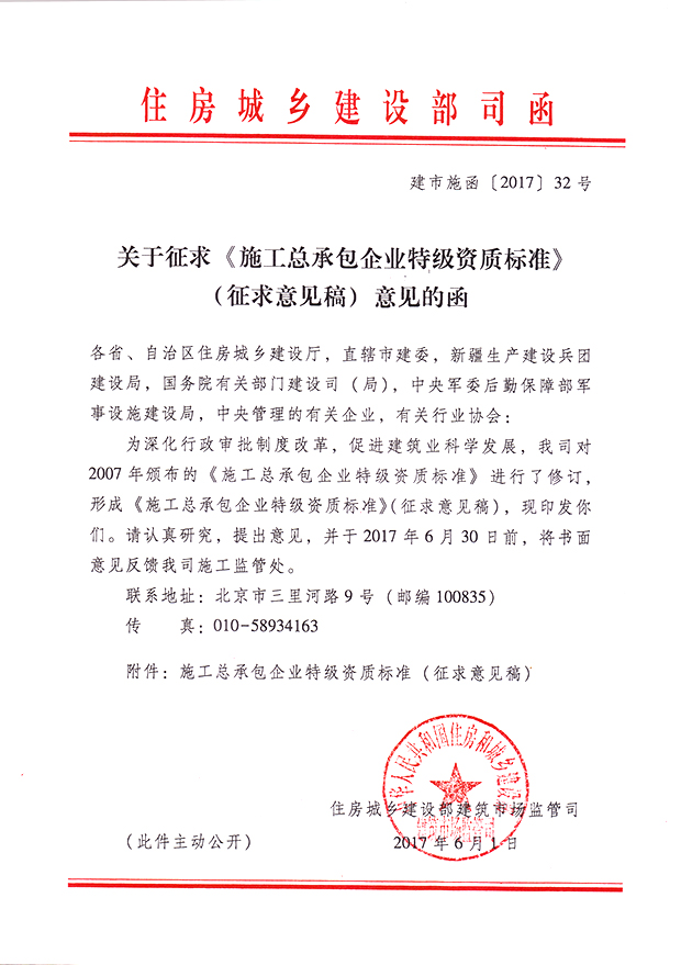 关于征求《施工总承包企业特级资质标准》(征求意见稿)意见的函