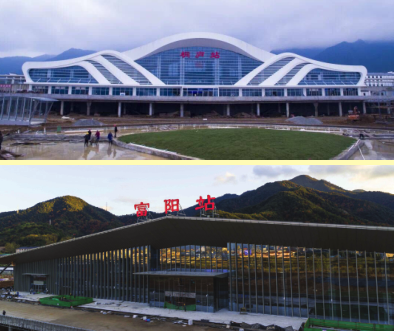 近日, 由中铁建设集团匠心打造的桐庐、 富阳两高铁站首次亮相。 桐庐站和富阳站分别位于杭州桐庐县城南部和富阳区 “江南新城” 中心地带, 总建筑面积均为12000平方米。 桐庐站安装了智能显示屏及空位信号灯,以及人性化的弧形墙角防撞设计,高铁的智能厕所可与机场媲美。富阳站车站大厅花岗岩饰面的圆柱直径1600毫米,厚度30毫米,以加工制作玉石的工艺进行拼装,展示了中铁建设人的匠心。