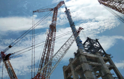 近日,浙江省工业设备安装集团有限公司第三分公司承建的浙江 石油化工有限公司4000万t/a炼化一体化项目二期工程3#380万t/a连 续重整装置三合一反应器顺利吊装。 据悉,该装置为单套重整装置,三合一反应器高达96m、重量约 613t,是整个项目最大、最重、最核心的设备。项目部采用2800t履带 吊为主吊,700t履带吊为辅吊,最终顺利完成吊装任务,也标志着该项 目正式进入安装工程施工高峰阶段。