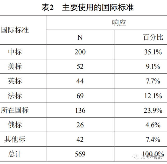 在“一带一路”沿线中国企业569多个对外工程项目中执行的主要标准整体情况看,中国标准占到35%,项目所在国标准占到了24%,其他是美国标准、英国标准、法国标准。如表2所示。