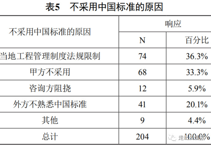 中国企业不了解当地标准,外方也不了解中国标准,中外标准的差异不清晰,故很难说服业主采用中国标准。