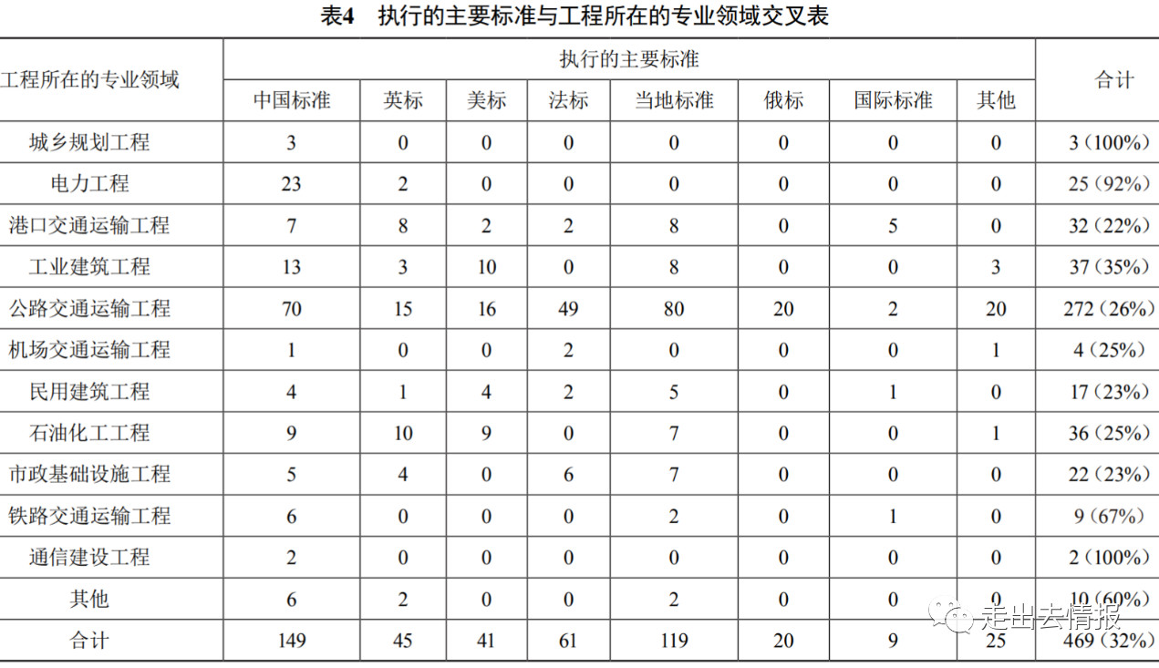 °公路、机场、港口交通运输工程领域、民用建筑领域、石油化工领域等在工程项目中执行中国标准的占1/4;