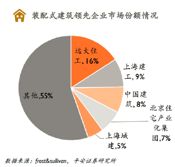 从施工企业看,由于装配式建筑并无特殊资质要求,具备建筑工程施工总承包资质(数量庞大)的建工企业均可承接相关建设工程,其中中国建筑、上海建工等经营市场位于东部发达地区的龙头企业优先受益。2017年,按PC装配式建筑构件收入计,远大住工是中国PC装配式建筑构件市场的最大参与者,市场份额达到15.9%。市场竞争对手包括大型国有建筑企业、地方构件制造企业和合资构件制造企业。其他主要参与者包括上海建工、中国建筑、北京住宅产业化集团、上海城建等。