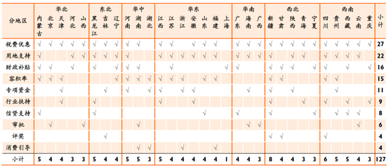 目前,全国31个省份均发布了相关的激励政策,新疆的激励政策类型最多(8项),其次是四川省(6项)。全国政策激励平均为4项,其中激励政策条款数量靠前的省份依次是新疆、四川、黑龙江、河南、湖南、内蒙古、江西、贵州、西藏等。