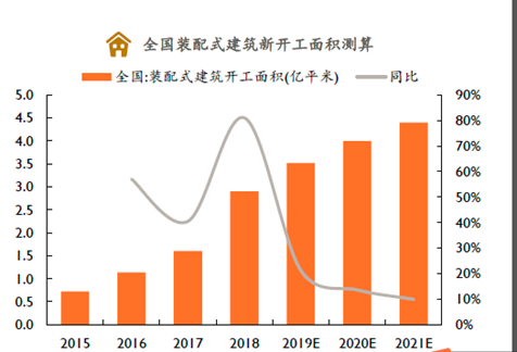 作为建筑工业化的发展重心,中国装配式建筑市场正迎来爆发式的增长机遇。在中央政府的装配式建筑发展计划和激励政策的引导下,各级省市纷纷开始了装配式建筑的发展热潮。我国装配式建筑开工面积由2015年的7360万平方米增长到2018年的2.9亿平方米(占新开工面积13.9%),复合增速达59%。
