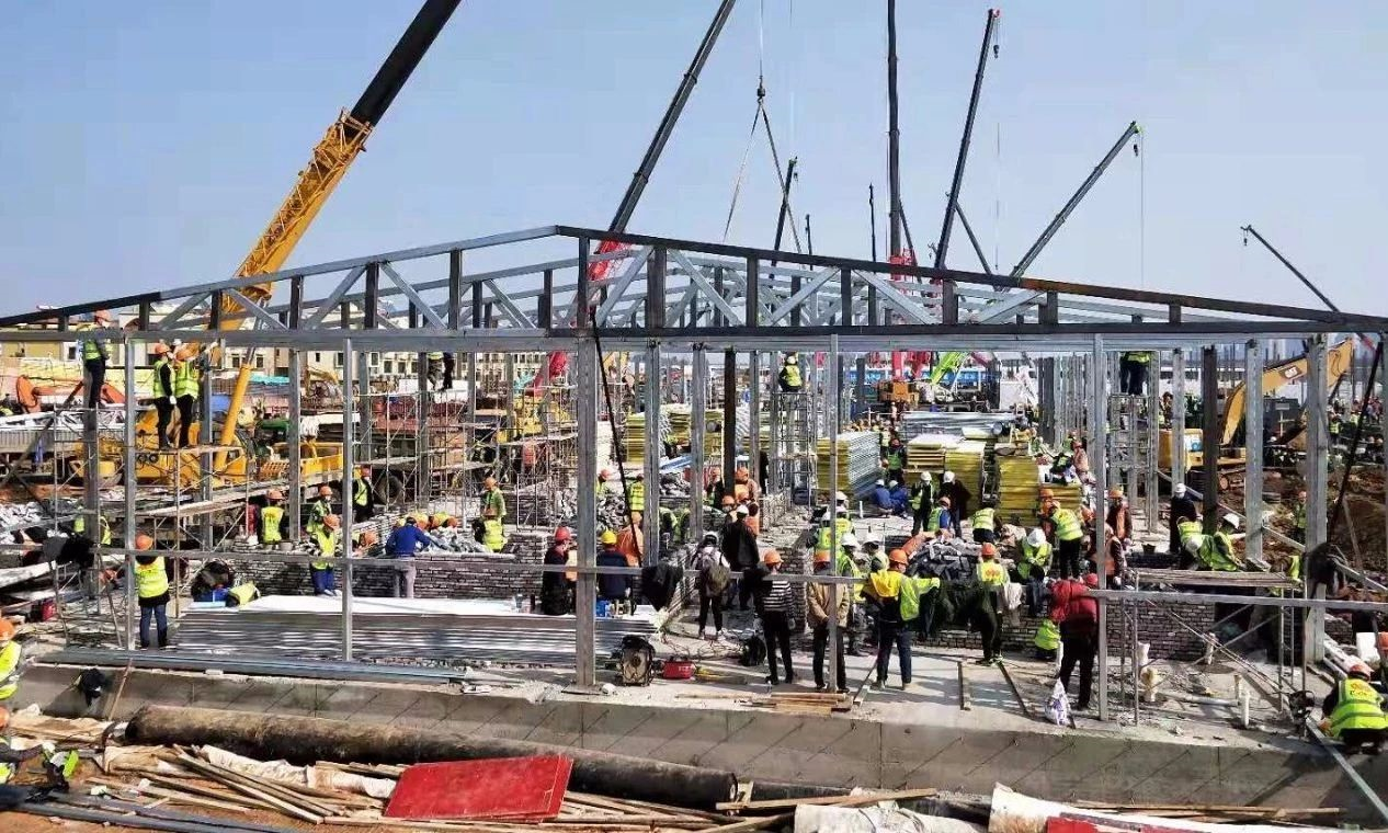 工程进度很快。1月28日,1栋双层病房区钢结构初具规模;1月31日,九成集装箱拼装基本完成,活动板房骨架安装近3000平方米;2月1日,医疗配套设备安装全面展开。