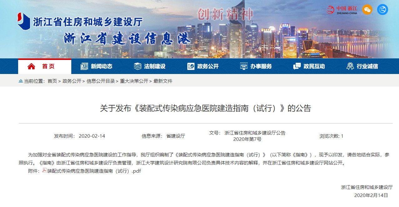 新冠肺炎疫情形势复杂而严峻,全国上下万众一心,共度时艰,我们正在面对一场没有硝烟的阻击战。为认真贯彻落实习近平总书记及党中央、国务院、省委、省政府的各项决策部署,积极应对疫情发展的严峻形势和可能的突发状况,切实加强对全省装配式传染病应急医院建设的工作指导,浙江省住房和城乡建设厅组织了由浙江大学建筑设计研究院和中建三局集团有限公司牵头,浙江省建筑设计研究院、浙江亚厦装饰股份有限公司、浙江精工钢结构集团有限公司、杭萧钢构股份有限公司、汉尔姆建筑科技有限公司参与的团队,整合在医疗建筑及装配式建筑管理、设计、生产、施工等方面的经验,并充分总结借鉴北京小汤山、武汉火神山、武汉雷神山医院等实践成果,针对如何高速度高质量地建造装配式传染病应急医院的目标,编制完成了《装配式传染病应急医院建造指南(试行)》(以下简称《指南》)。