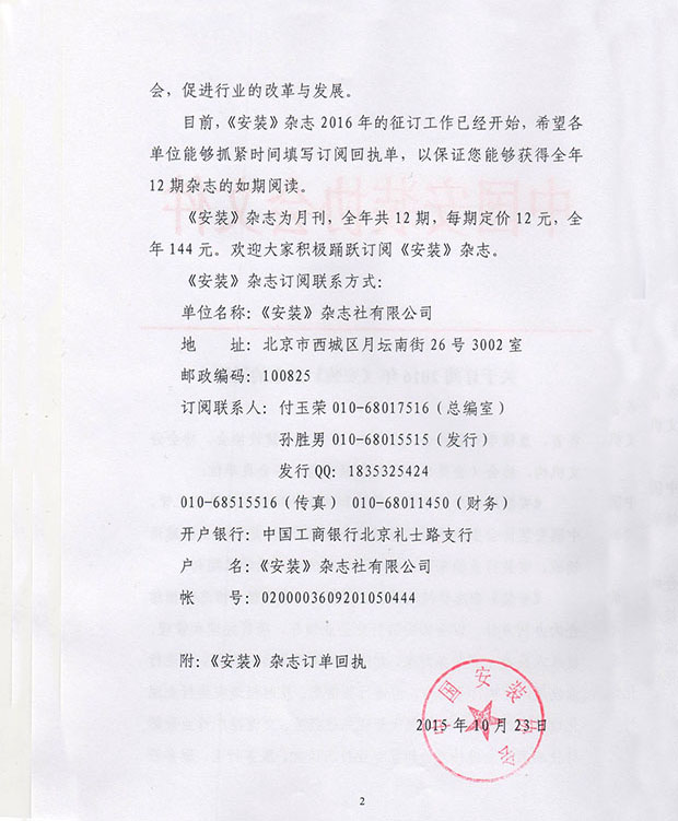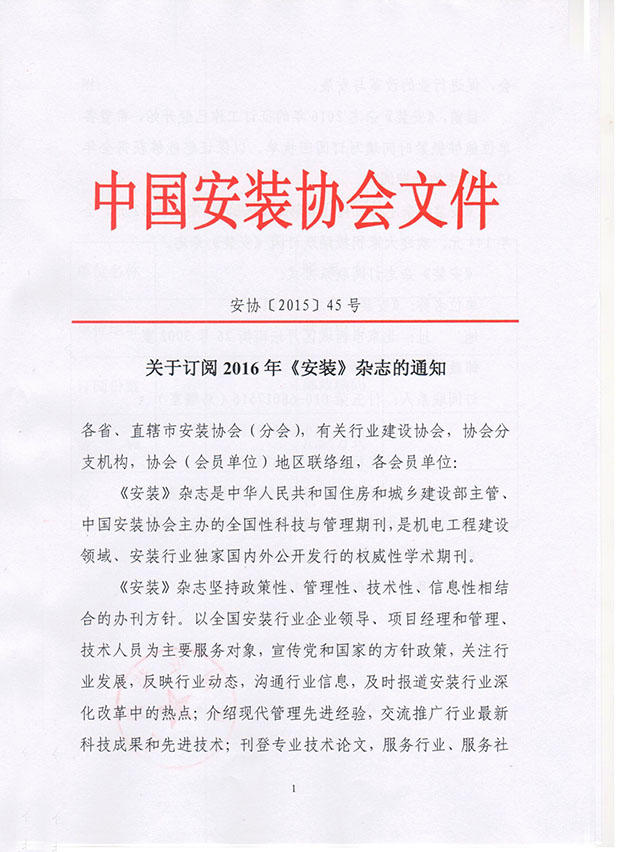 关于订阅2016年《安装》杂志的通知