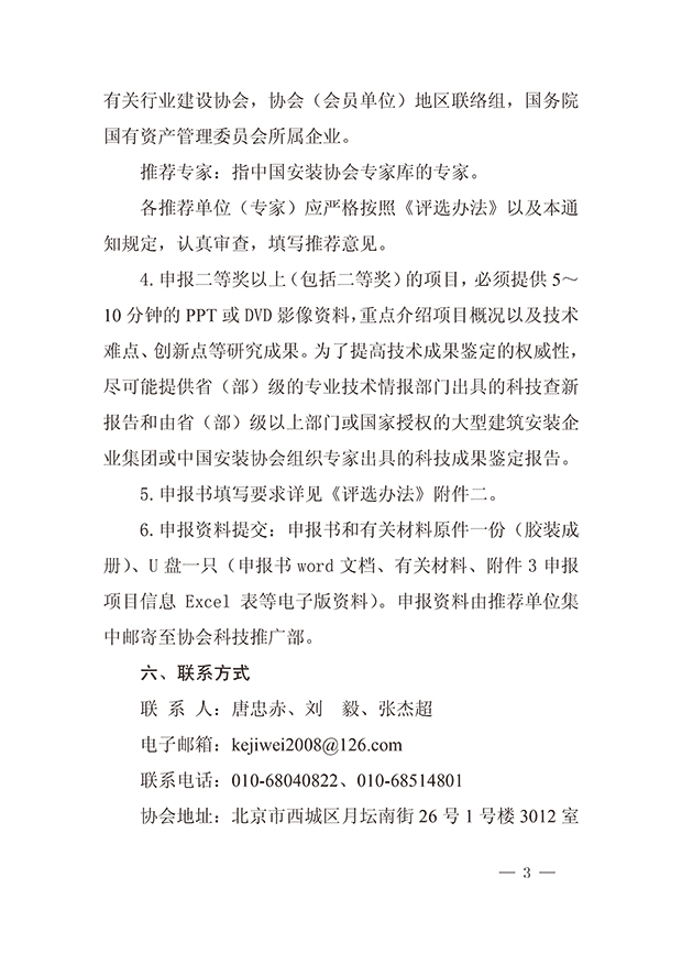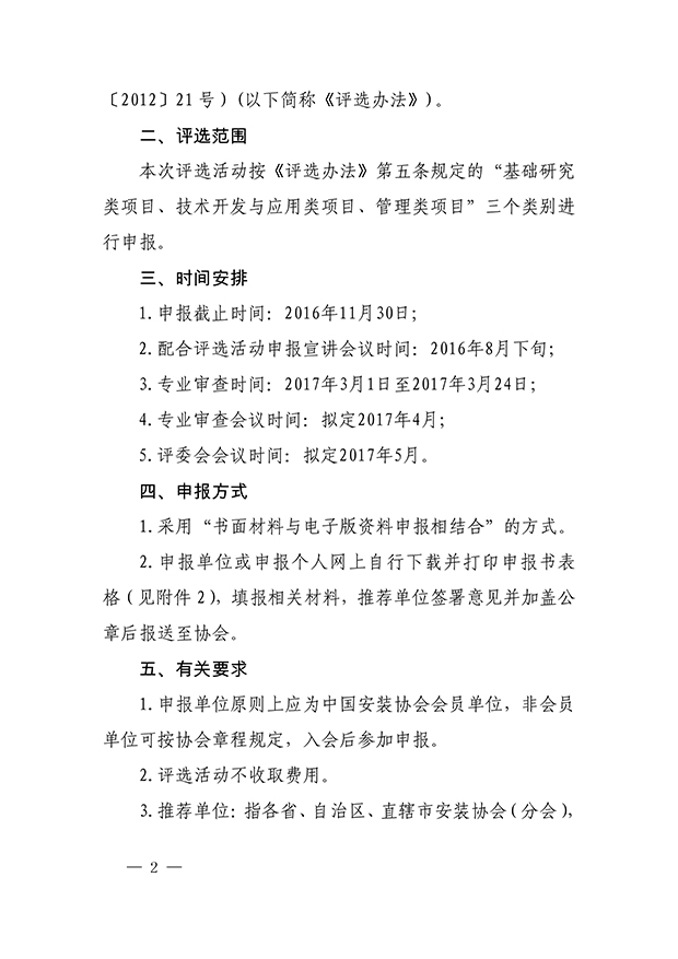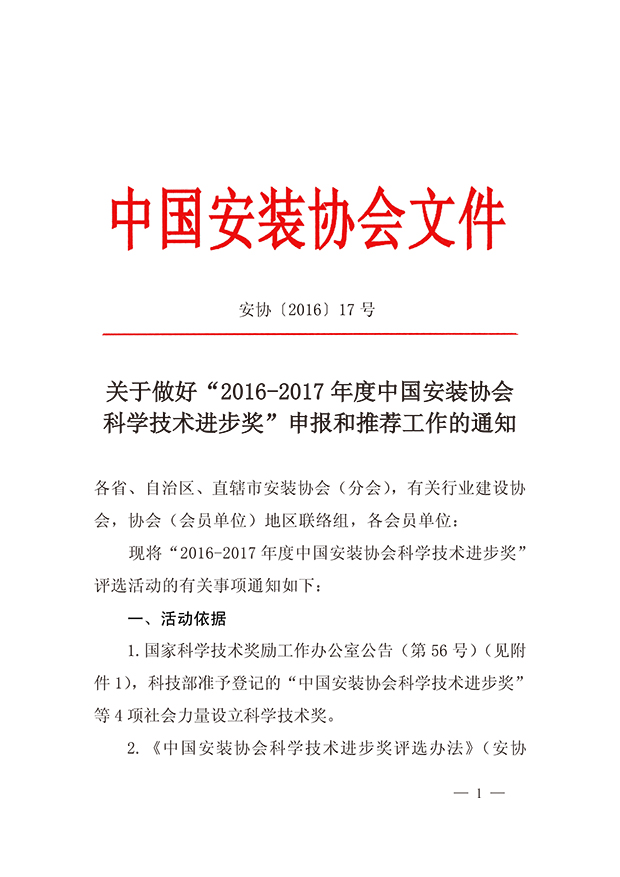关于做好“2016-2017 年度中国安装协会科学技术进步奖”申报和推荐工作的通知