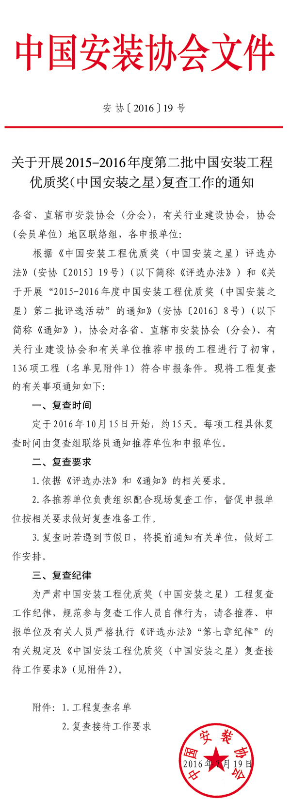 关于开展2015—2016年度第二批中国安装工程优质奖(中国安装之星)复查工作的通知