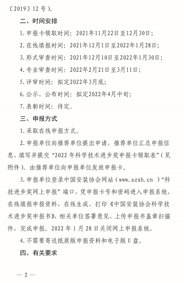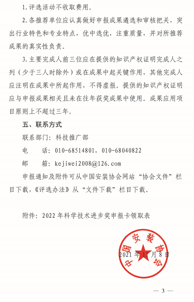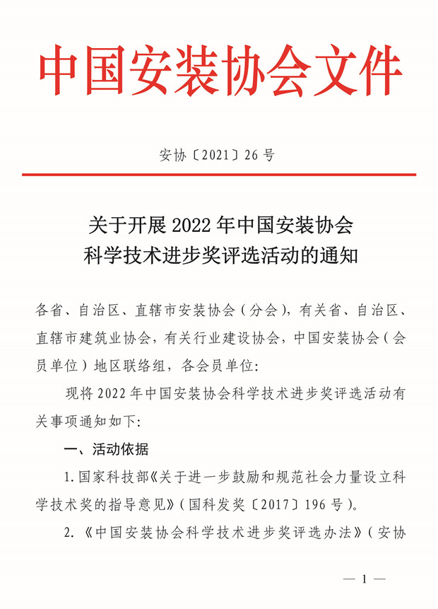 关于开展2022年中国安装协会科学技术进步奖评选活动的通知