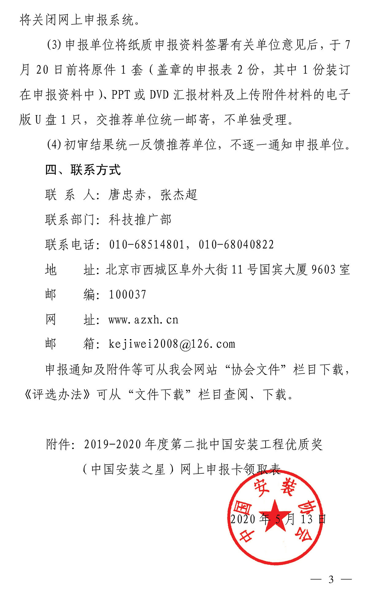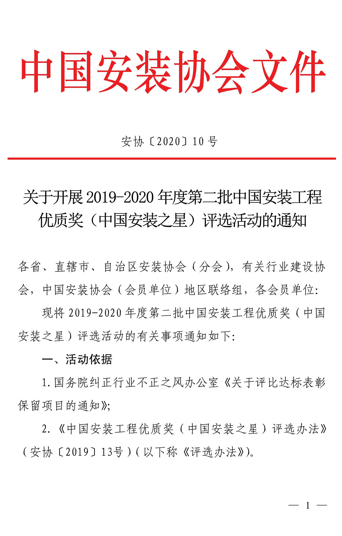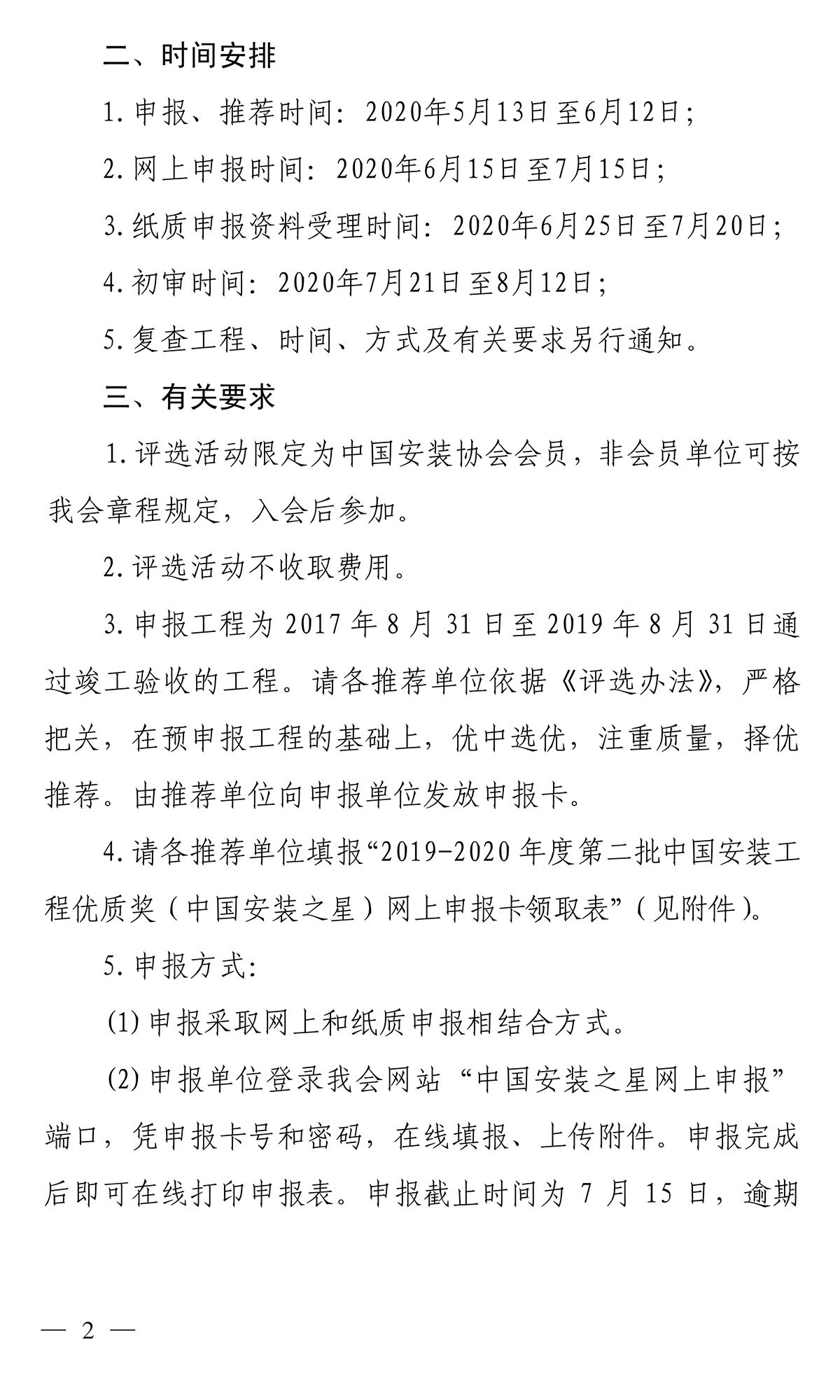 关于开展 2019-2020 年度第二批中国安装工程优质奖(中国安装之星) 评选活动的通知