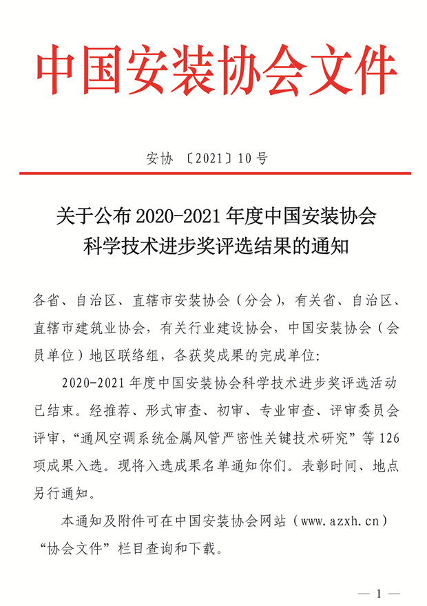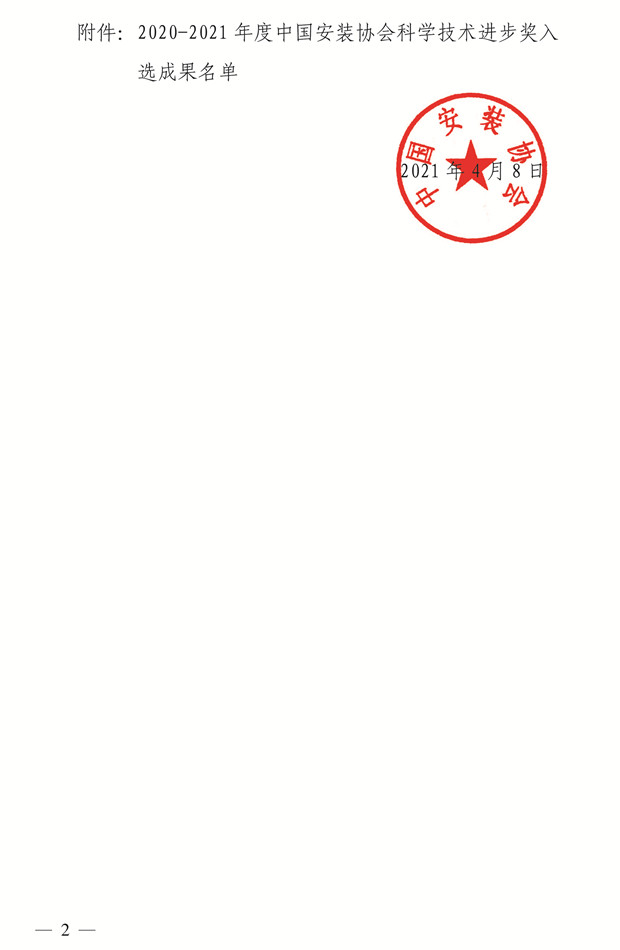 关于公布 2020-2021年度中国安装协会科学技术进步奖评选结果的通知