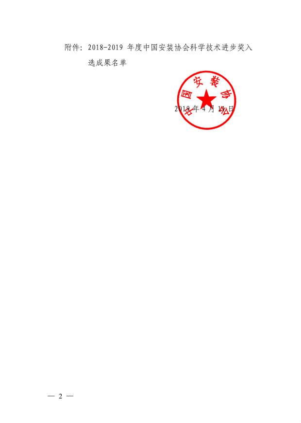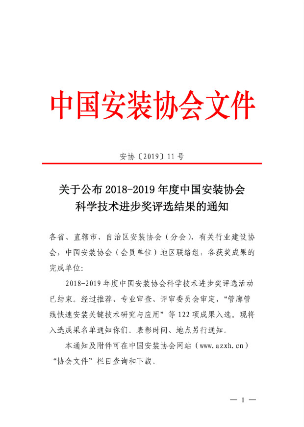 关于公布 2018-2019 年度中国安装协会科学技术进步奖评选结果的通知